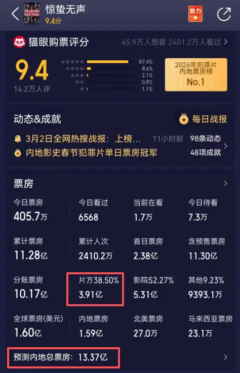 而网传这部影片预测票房为13.3亿,根据猫眼平台数据显示,片方或许能够分得5亿。