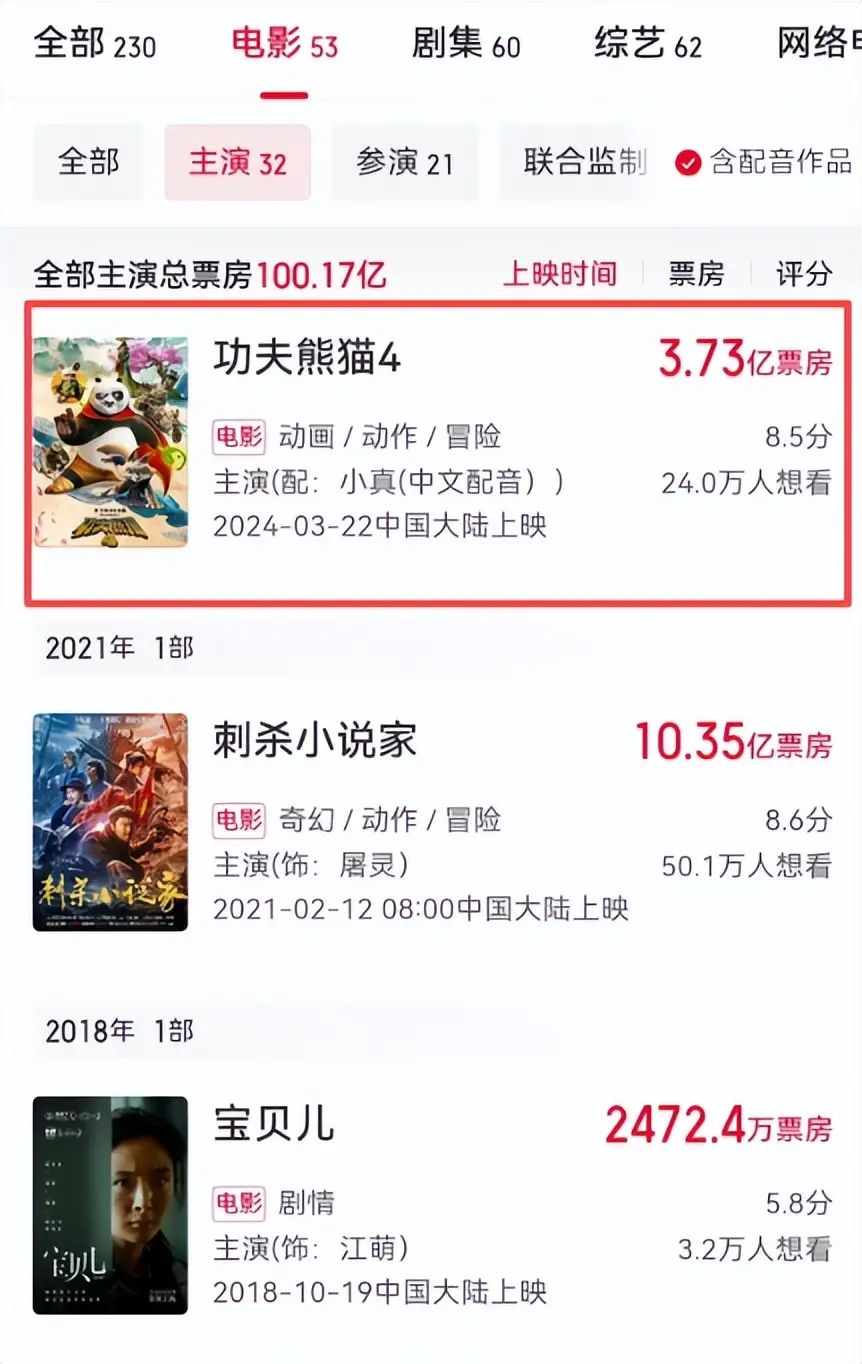 还有她分别配音的《功夫熊猫》第三部与第四部,都算在了杨幂的主演票房中。