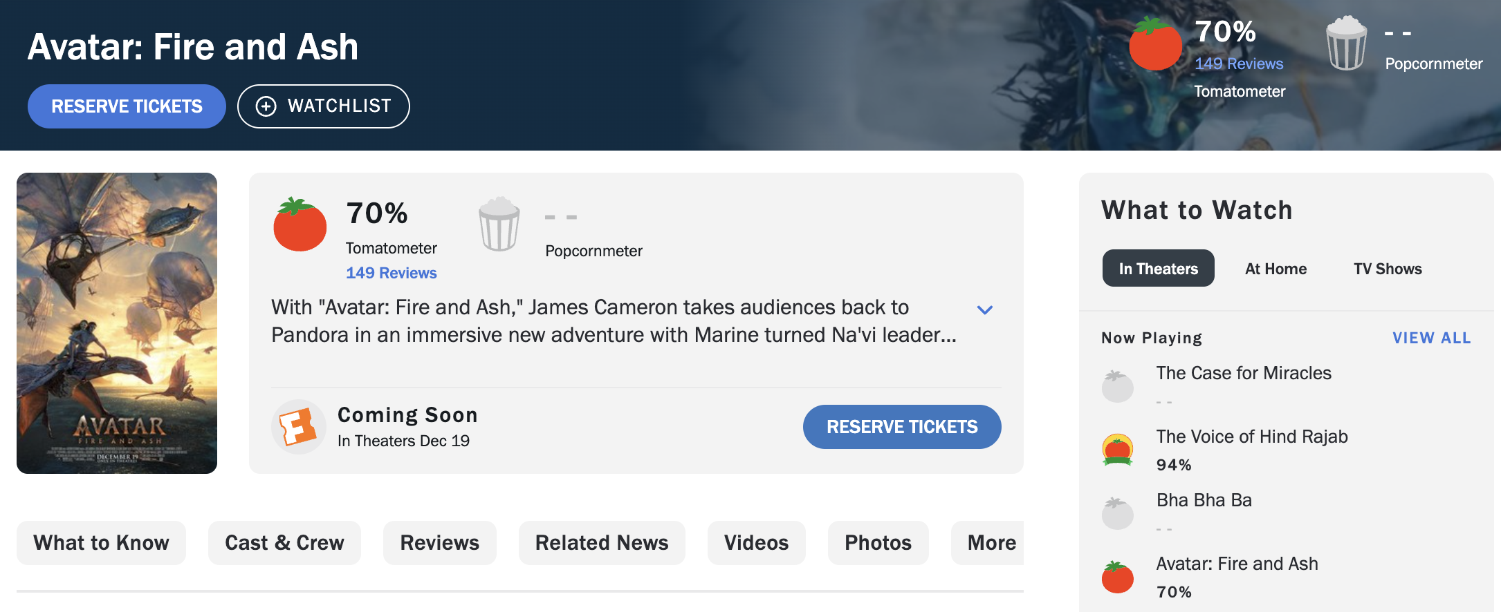 观众评价方面,《阿凡达3》在美国影评网站“烂番茄”口碑新晋解禁,新鲜度70%,同样难称佳绩。部分评分者称,影片技术卓越、视效壮丽,但无法掩饰其内容同质化之感,也有影评人写道:“它不是你全年间看到的最糟糕的电影,但它很无聊——令人麻木的、在椅子上打瞌睡的无聊。”