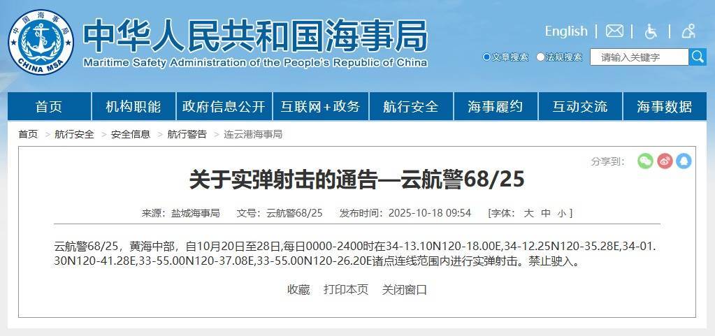 央视网消息:据中国海事局网站消息,盐城海事局发布航行警告,10月20日至28日盈禾配资,每日0时至24时,黄海中部部分海域进行实弹射击,禁止驶入。